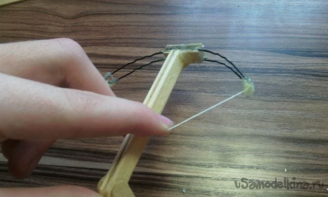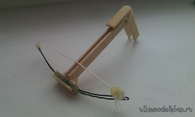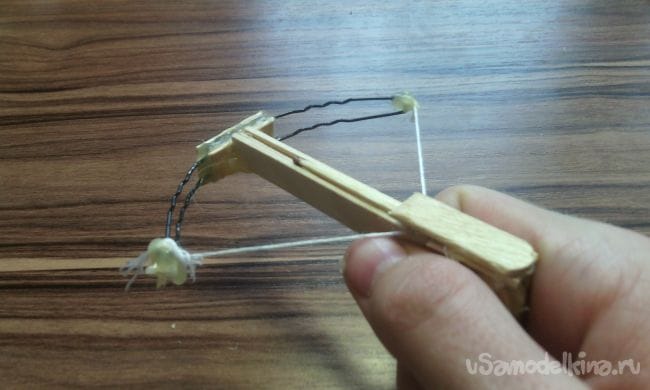 Ну вот и всё, мини арбалет готов! Для того чтобы стрелять нужно отодвинуть "тетиву" назад, положить в паз спичку, прицелиться и пальцем сдвинуть "тетиву" вверх с засечек, таким образом мини арбалет выстрелит. И не забывайте о технике безопасности!