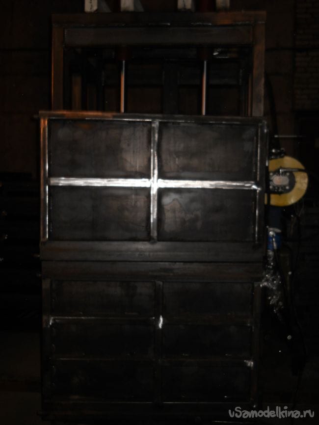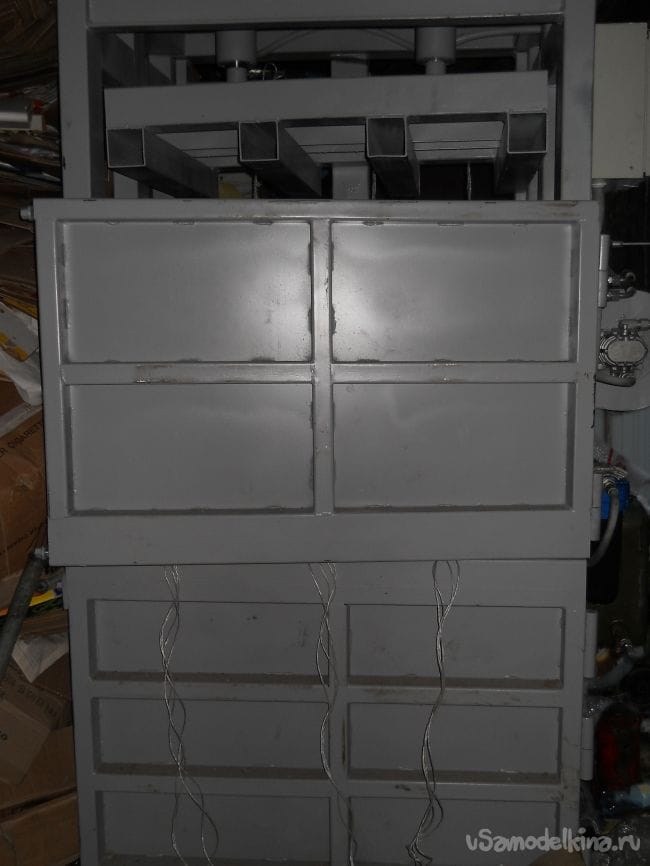 Спереди стоит две двери. Нижняя для выгрузки готовой кипы, верхняя для загрузки и догрузки сырья. Двери установлены на точеных петлях диаметром 45мм.