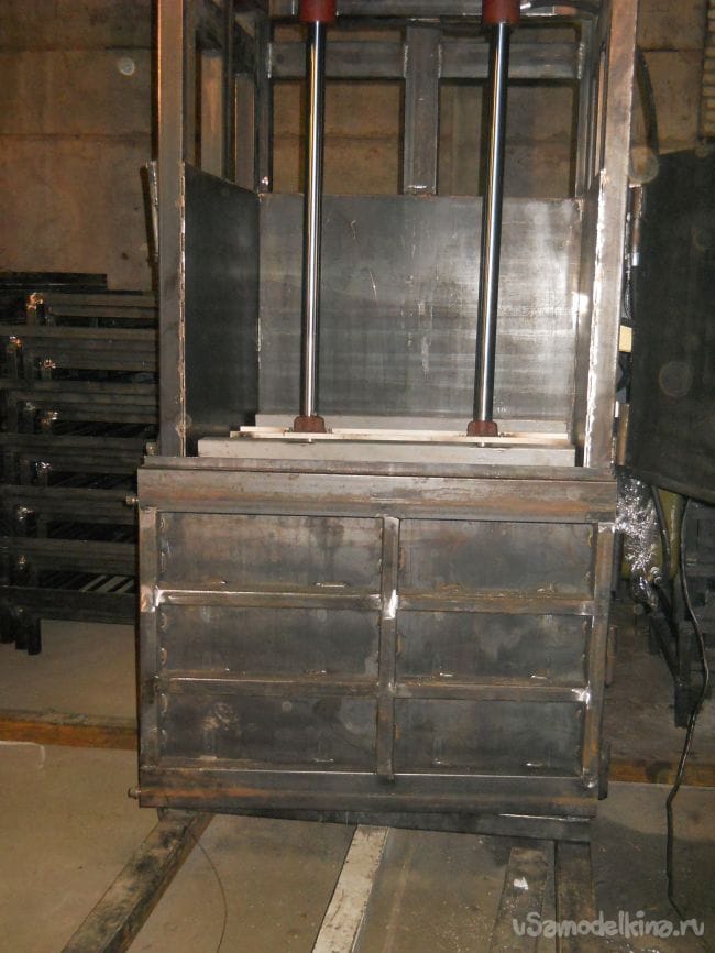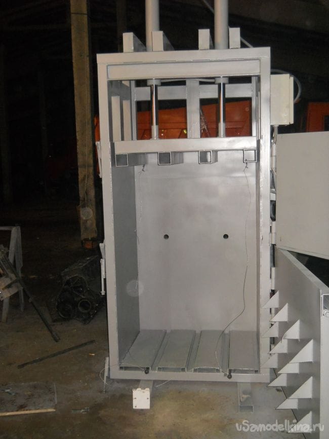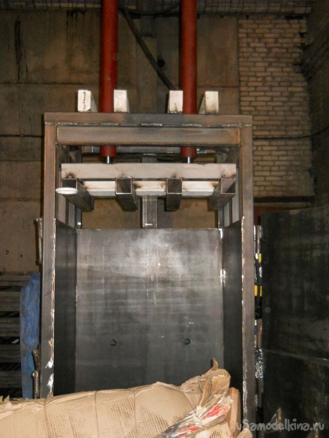 Если пресс используется для прессования картона то на нижнюю дверь привариваются металлические угольники. Они нужны для предотвращения поднятия картона при его до загрузки.