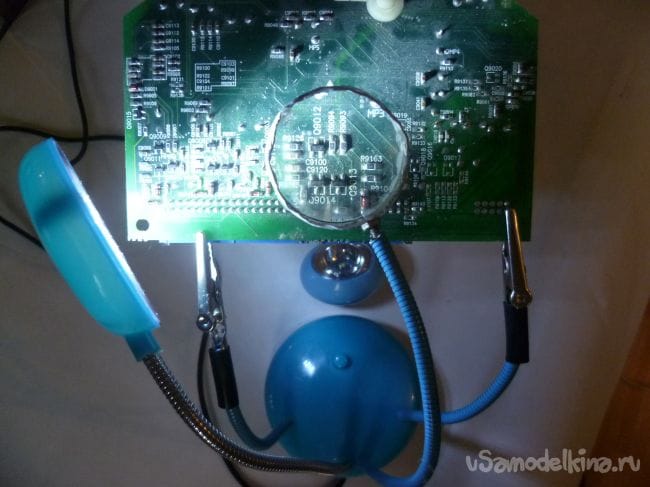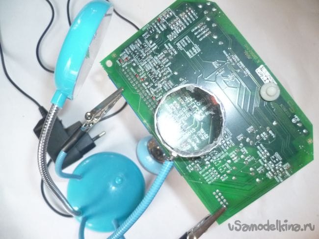 Основой устройства служит светильник с семью светодиодами. Наша задача- установить на него дополнительные лапы для крокодилов (держать саму печатную плату) и лапу для увеличительного стекла.