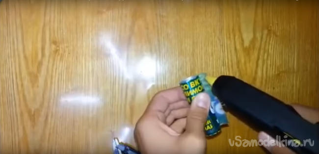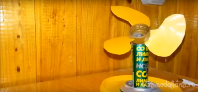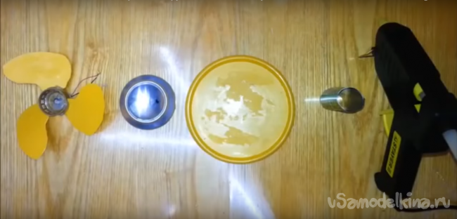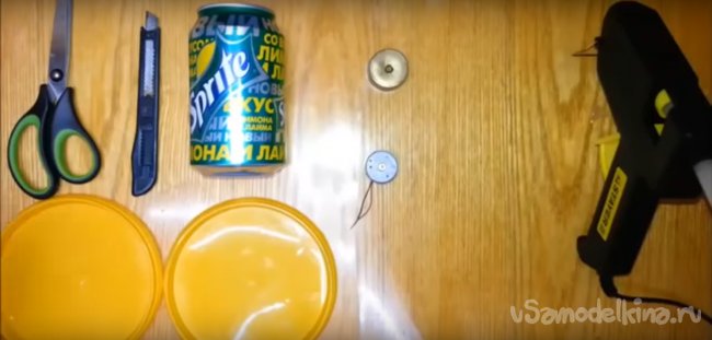 Для этого нам понадобится: Ножницы, канцелярский нож, баночка с под воды, две крышки с под майонеза, крышка с под бутылки, моторчик и клей.