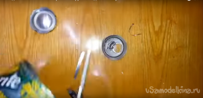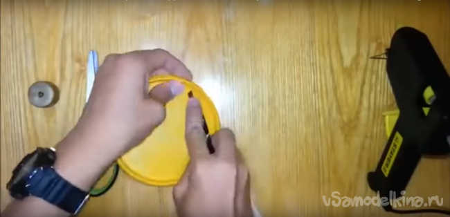 С начала нужно сделать винт! Берём ножницы и крышку с под майонеза, вырезаем форму винта.