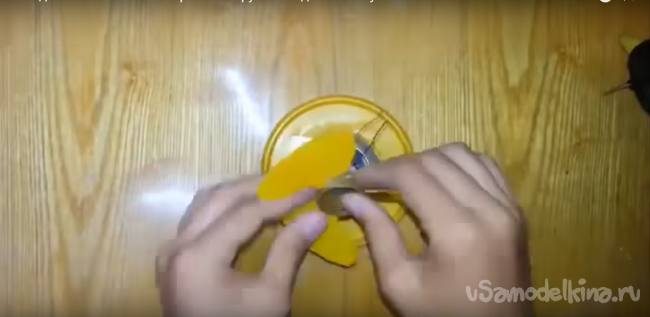 Вырезаем с крышки с под майонеза лопасти и вставляем их в крышку с под бутылки.