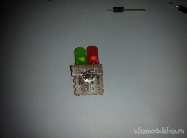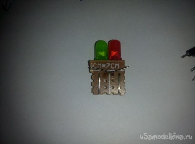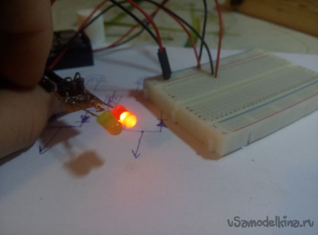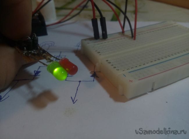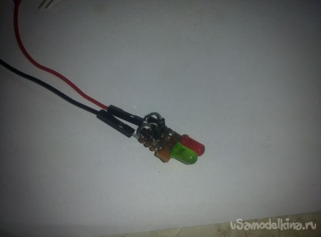Далее подпаиваем провода разных цветов, и все, можно тестировать.Перед тестом определим, какой диод определяет полярность. Берем батарейку, зная ее полярность, и соединяем с тестером. Какой светодиод засветится (если вы правильно соединили провода: красный с "+" а черный с "-"), тот и будет означать, что полярность соблюдена верно.
