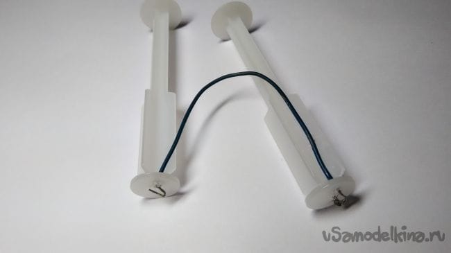 Шаг 5: Далее берём провод и прикрепляем его к поршням шприца. После того как мы это сделали,вставляем батарейки и поршни.