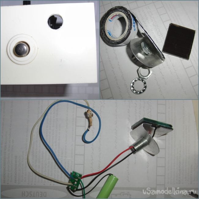 Из пластины мастерим поворотный держатель для солнечной батареи, чтобы можно было направлять её к солнечному свету. Приклеиваем двухсторонним скотчем солнечную батарею к пластине и сгибаем её под углом 45 градусов. Провода просовываем во втулку, которая будет соединять пластину с корпусом часов. Просверливаем отверстия сверху в корпусе часов и вставляем втулку, закрепляем гайками.