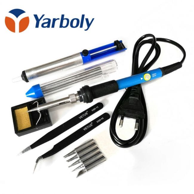 Почти каждой самоделке нужен электрический паяльник для пайки каких-либо проводов. На данном описании представлен целый комплект для пайки чего-либо. В комплект входят сам электро паяльник, два разных пинцета, оловоотсос, подставка, пластиковый футляр.
