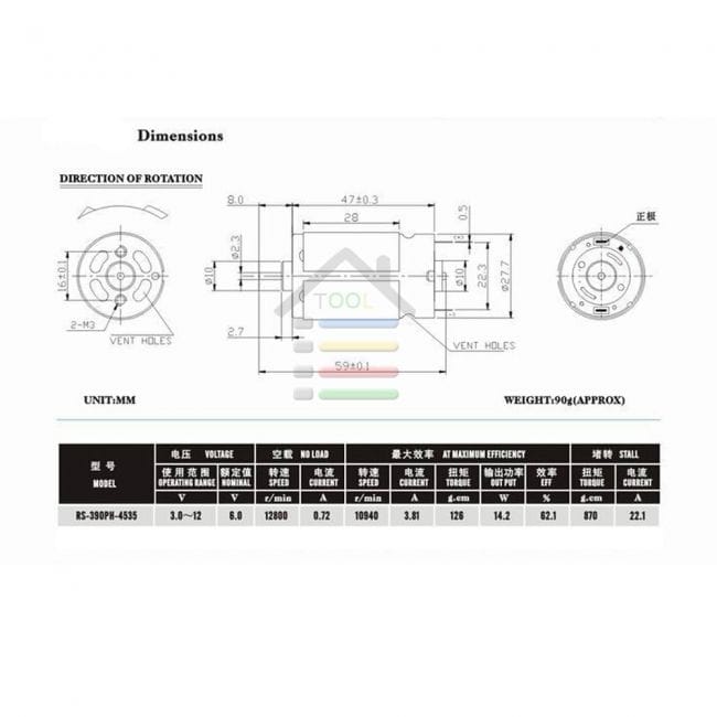 Номинальная мощность моторчика - 20 ватт. Размеры показаны на фотографиях.