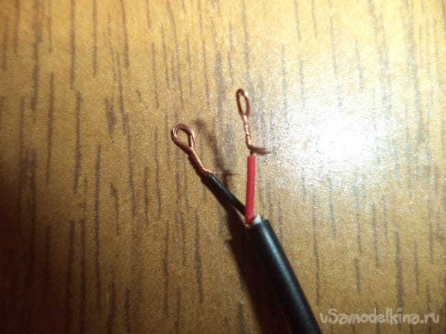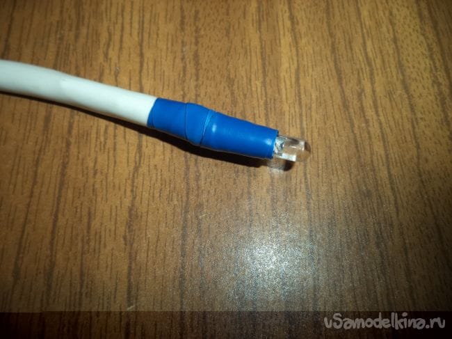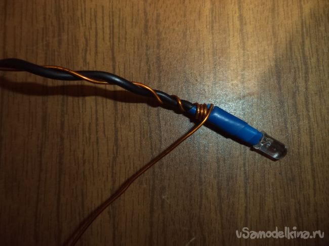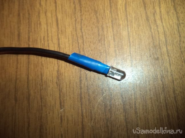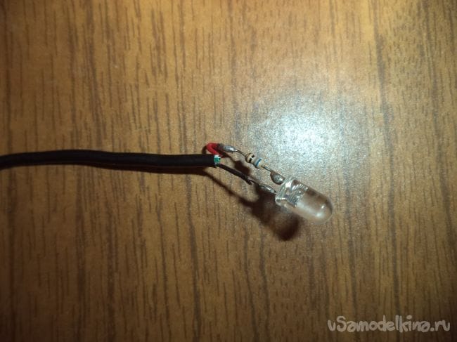 Взял токоограничивающий резистор, паяльником припаял его к светодиоду и также припаял светодиод с резостором к проводам, соблюдая полярность - красный-плюс, черный-минус.