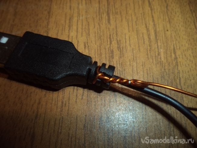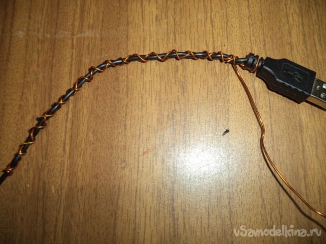 Далее зацепил медную проволоку в это углубление и замотал весь кабель этой проволокой до наклеенной изоленты. И так три раза - то в одну сторону, то в другую.