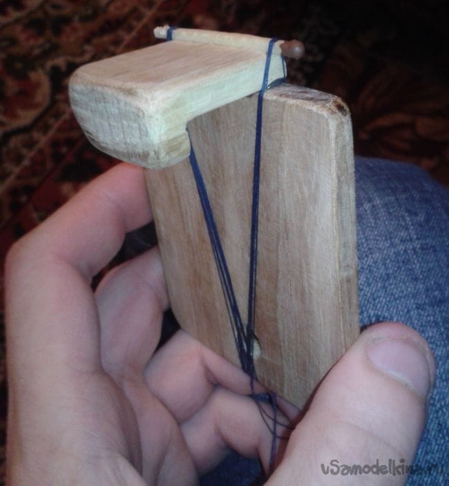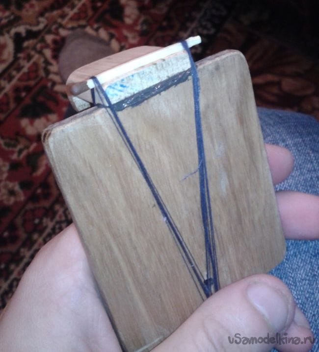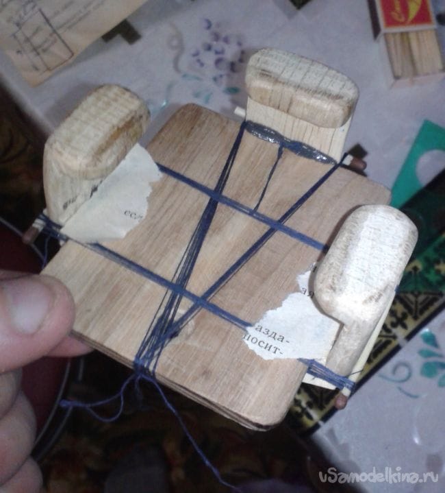 Эпоксидный клей высыхает достаточно долго, но держать руками длительное время склеиваемые детали просто не хватит терпения. Недолго думая я решил, что такую конструкцию проще всего скрепить ниткой и спичками, обмотав по ее краям десяток витков. Из-за большого количества витков нитки все держится надежно, а главное прижимаются детали достаточно плотно.