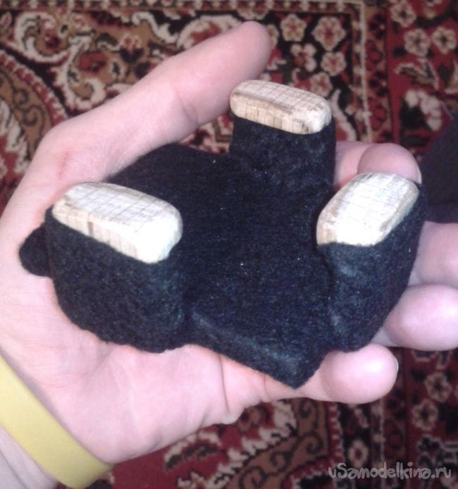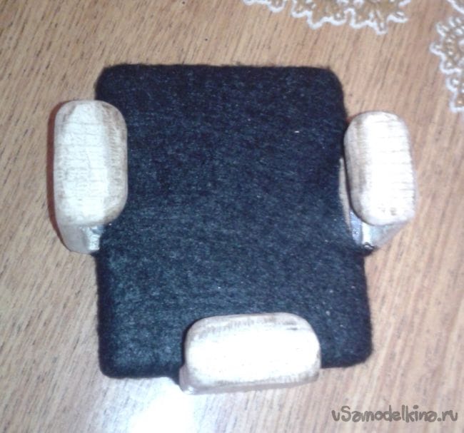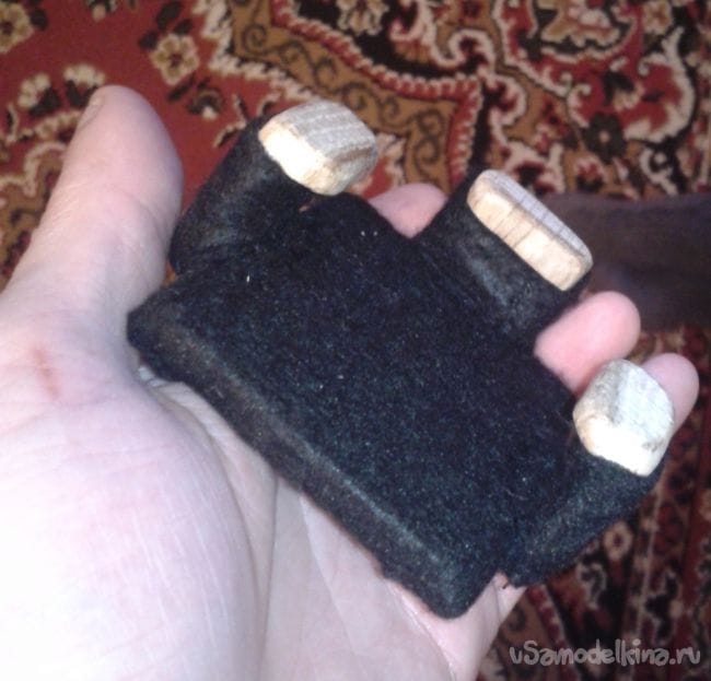 Пришло время преобразить подставку. Обшиваем ее с помощью черного фетра, сначала это делаем с спинкой, после чего переходим на лапки.