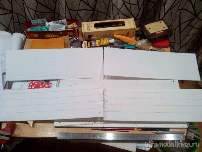 По чертежу вырезаем заготовки элеронов, они делаются из двух слоев потолочки, и склеиваем половинки.