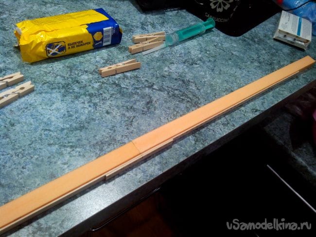 К пеноплексовому лонжерону приклеиваем деревянный лонжерон, склеенный из линейки (длина 800 мм).