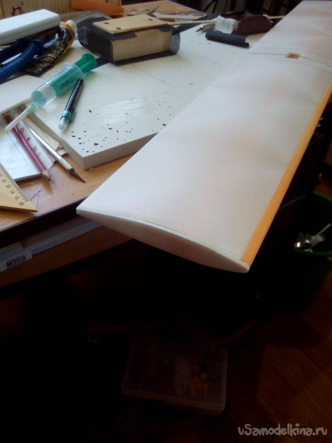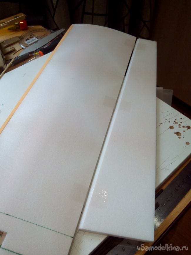 Заготовки передней кромки делаем из пеноплекса (или из потолочки) и приклеиваем к крылу.