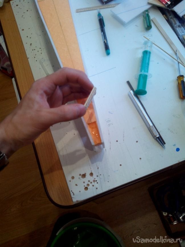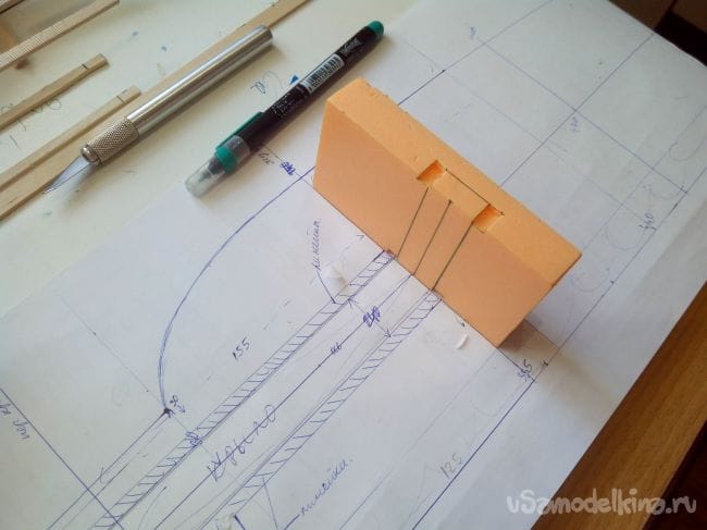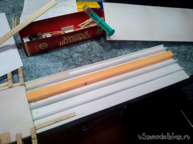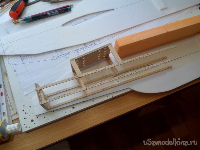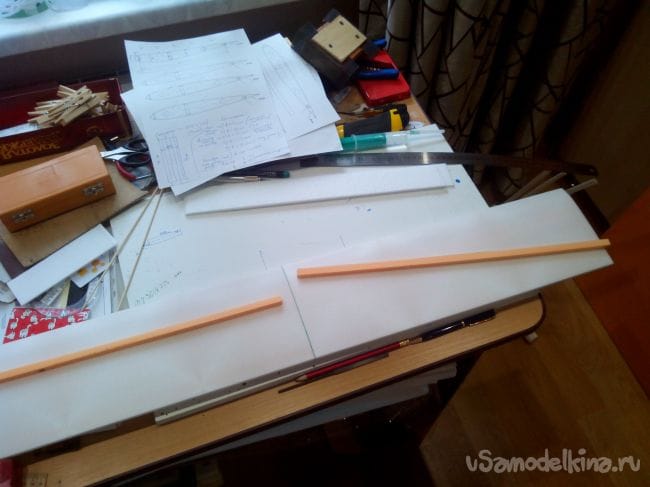 Из обрезков потолочки нарезаем лонжероны. Центральный делаем из пеноплекса (на фото оранжевый)