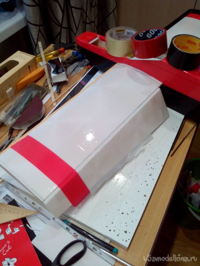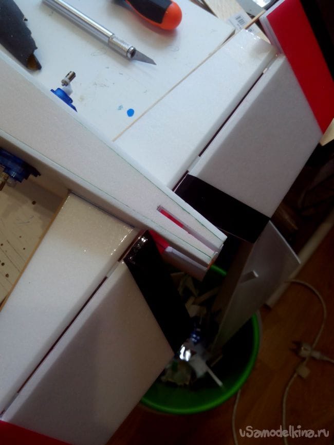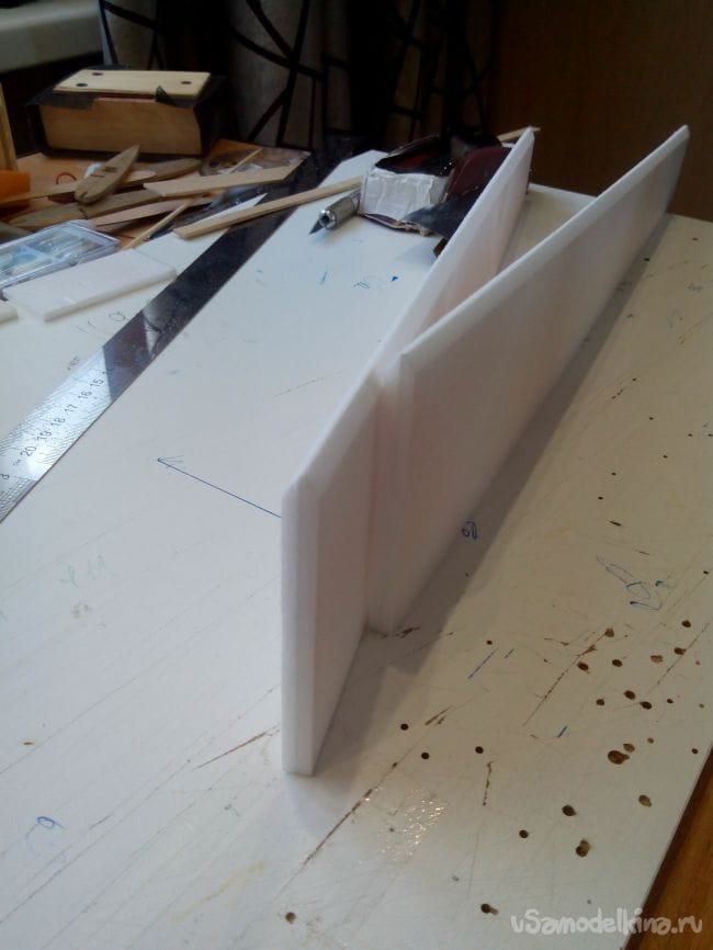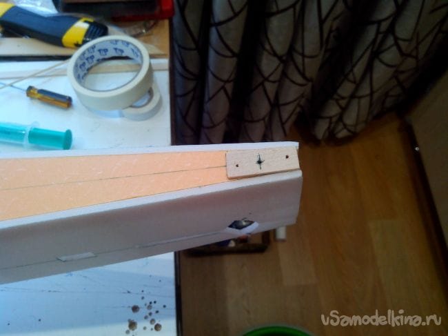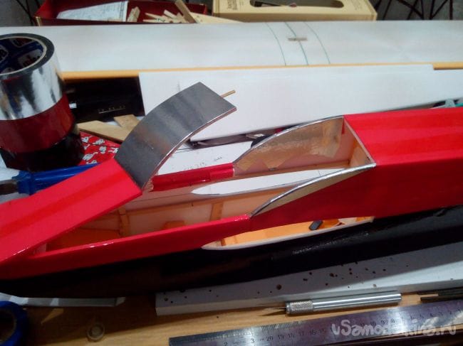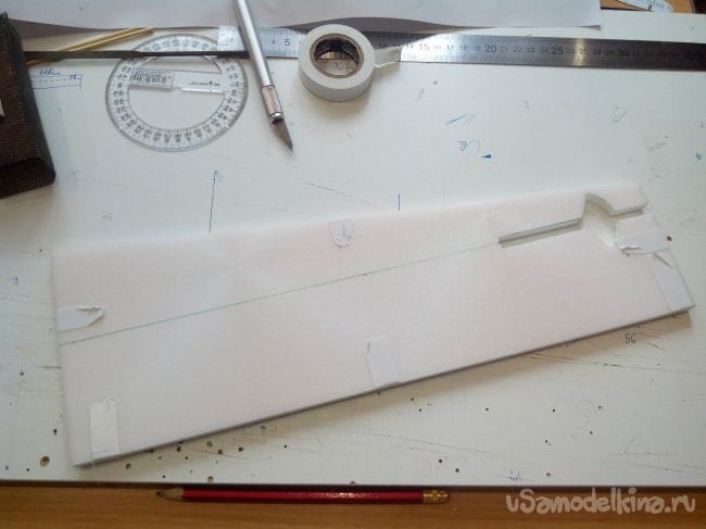 Киль и руль направления, для облегчения, сделаны из одного слоя потолочной плитки. Стык так же сошкуривается. Петлями руля направления служит непосредственно обтяжка из скотча.