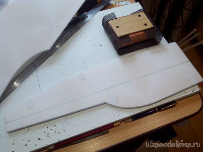 Обводим переднюю часть по шаблону маркером на листе потолочки прямо на лицевой стороне и чертим ось, на которой будет располагаться мотор, крыло и стабилизатор. Кроме того, эта линия будет границей, разделяющей цвета при обклейке модели скотчем.