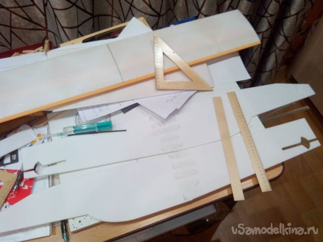 Когда клей высохнет, приклеиваем пеноплексовое днище фюзеляжа. На данном этапе все выравниваем по угольнику, иначе малейший перекос потом отразится на полетных характеристиках. Откладываем фюзеляж сохнуть и двигаемся дальше.