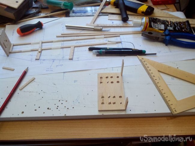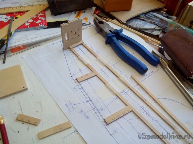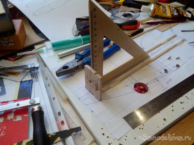 Распускаем деревянную линейку на реечки шириной 5 мм и на чертеже начинаем склеивать клеем ПВА каркас. Моторама делается из фанеры 3мм, отверстие на ней - для вывода проводов к регулятору оборотов. Все детали приклеиваем с применением угольника. Выкос двигателя в дальнейшем, если понадобится, лучше реализовать подкладыванием под крепление мотора шайбы, чем криво приклеивать мотораму.