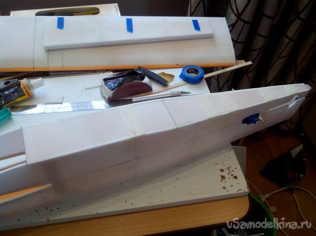 Для получения одинаковых элеронов соединяем их друг с другом изолентой и обрабатываем края наждачкой.
