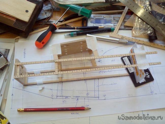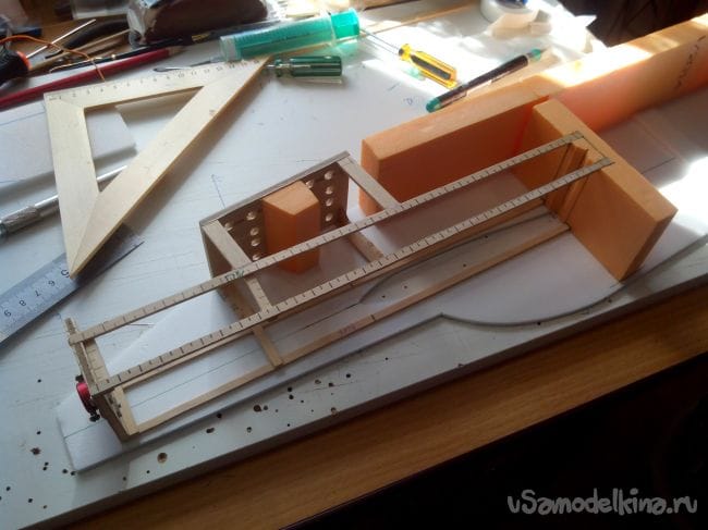 Прикладываем данную конструкцию к носовой части фюзеляжа. Крыло будет располагаться между двумя реечками.