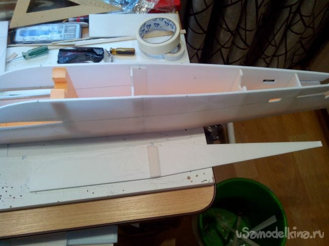 Соединять части фюзеляжа лучше совмещая по центральной линии, так не будет смещения отверстий для стабилизатора. Края в месте стыка половинок можно подправить наждачкой. Изнутри на стык половинок наклеиваем полоску из потолочной плитки.
