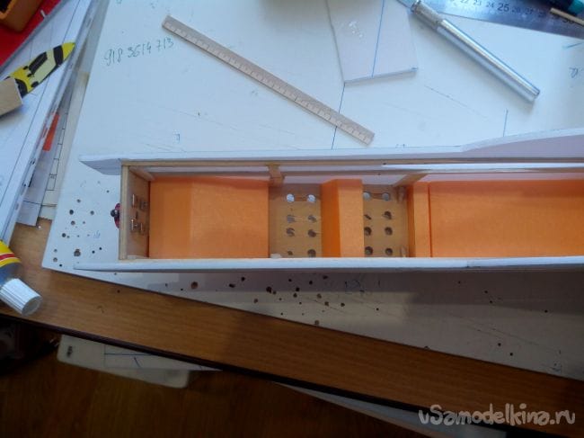 Приклеиваем вторую часть фюзеляжа, не забывая про угольник. В хвостовой части размещаем шпангоуты. Места в шпангоутах для проводки хвостовых сервоприводов удобней вырезать в верхней части.