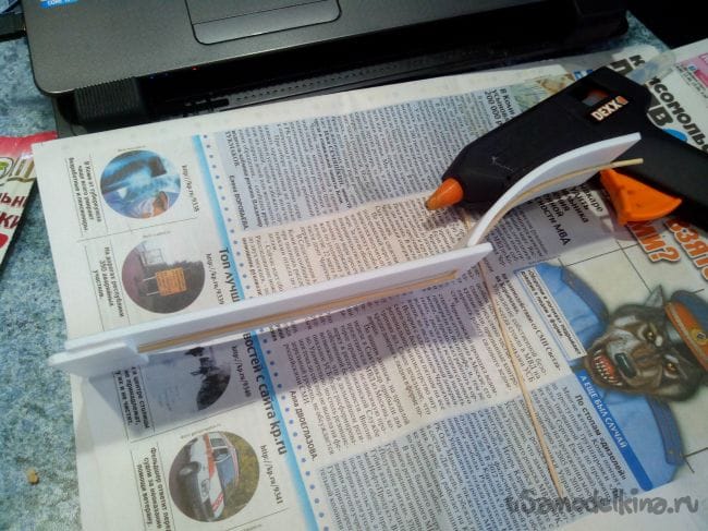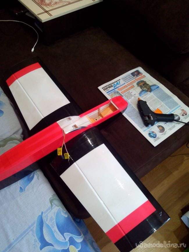 После завершения обтяжки приклеиваем крыло. Для большей прочности лучше клеить на эпоксидку, но если ее нет – потолочным клеем с закреплением термоклеем изнутри.