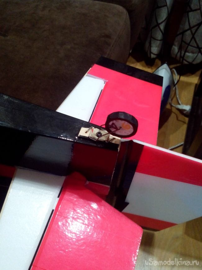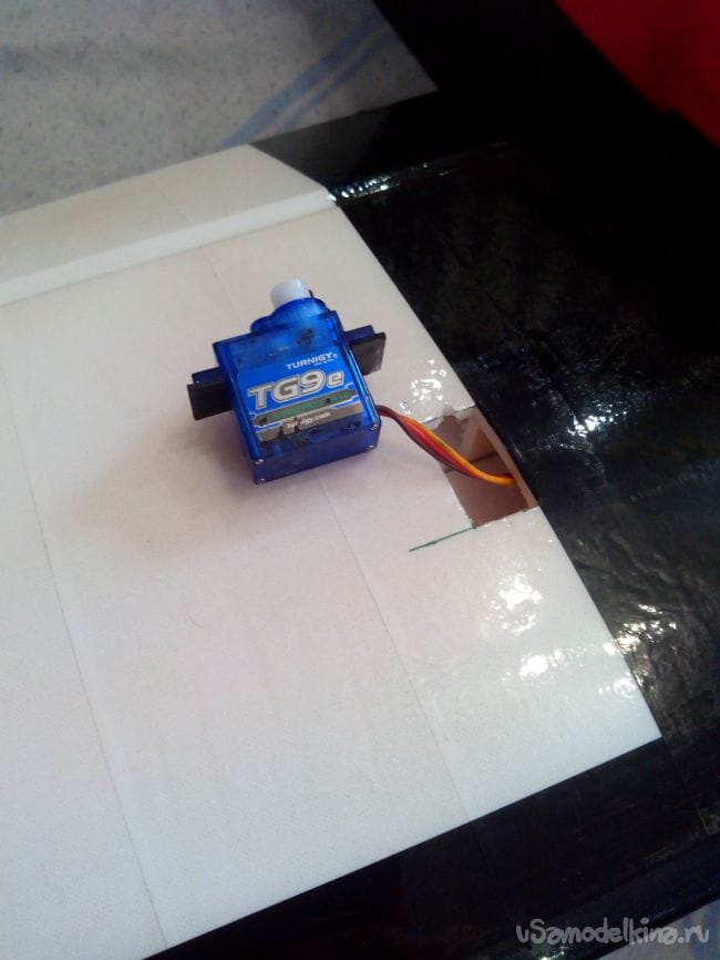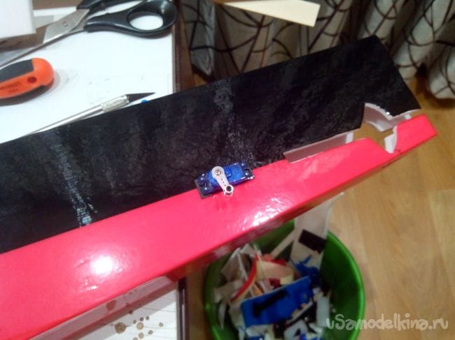 Затем обклеиваем нижнюю часть черным скотчем и приклеиваем хвостовые сервоприводы. Лучше всего на эпоксидку-пятиминутку.