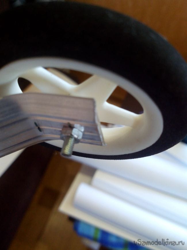 Отверстие в колесе рассверливаем до нужного диаметра и прикручиваем к стойке. Гайку лучше зафиксировать капелькой лака для ногтей или специальным фиксатором резьбы.