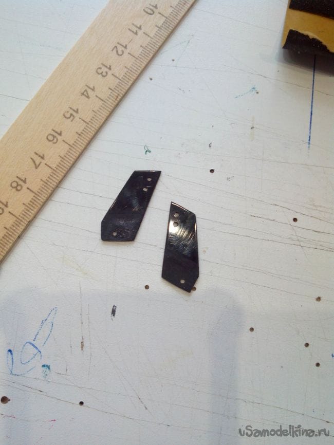 Кабанчики в рули и элероны можно вклеить покупные или сделать их самостоятельно из подходящего пластика, например, строительный уголок или старый CD-диск. Тонким сверлом сверлим в кабанчиках несколько отверстий, чтобы можно было механически менять расходы, а в нижней части делаем отверстие для кусочка проволоки, так кабанчик лучше фиксируется и не будет выскакивать. Клеим кабанчики на эпоксидку-пятиминутку.