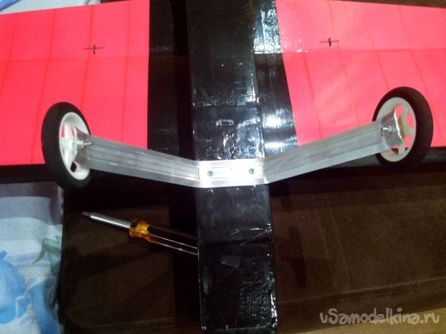Стойку шасси выгибаем из пластины для закрывания швов в линолеуме. На концах сверлим отверстия для болтиков-осей.