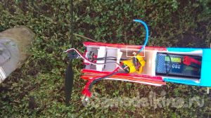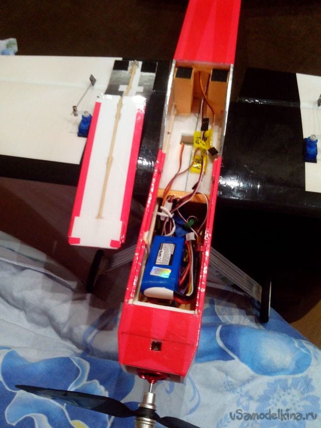 Размещаем внутри остальную электронику, соединяем все провода и укладываем аккумулятор для проверки центровки. Центр тяжести как раз на одну треть от передней кромки крыла.