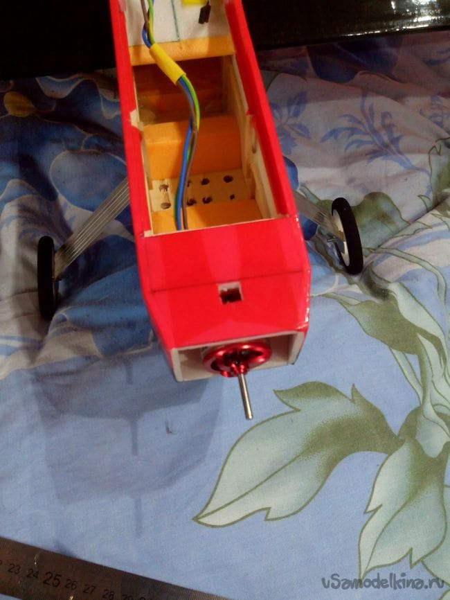 Размещаем провода хвостовых сервоприводов, прихватываем их кусочками скотча, а сами сервоприводы вставляем в отверстия (без клея). Слева – сервопривод руля высоты, справа – руля направления. Рекомендую сделать на проводах соответствующие пометки, чтобы потом было легче подключать их к приемнику.