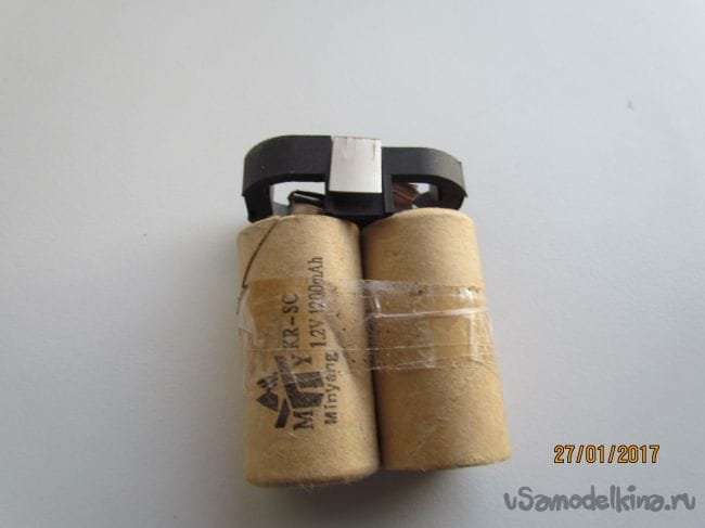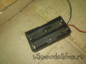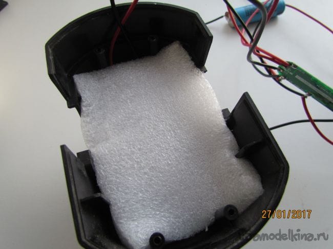 К ним припаиваем красный и черный провод, вставляем эти две батарейки с проводами в гнездо, положим плотный поролон. Батарейки изолируем скотчем и собираем все на место.