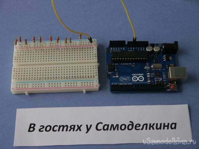 Шаг№3. На макетной плате устанавливаем 10 резисторов, подключая их к земле. Землю самой макетки также соединяем с GND на микроконтроллере.