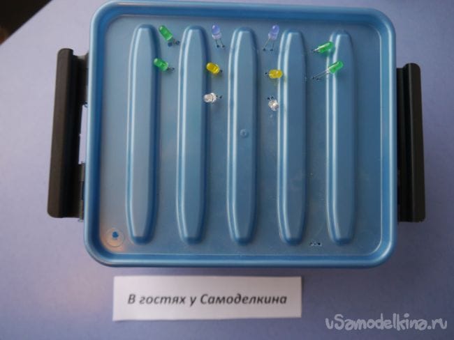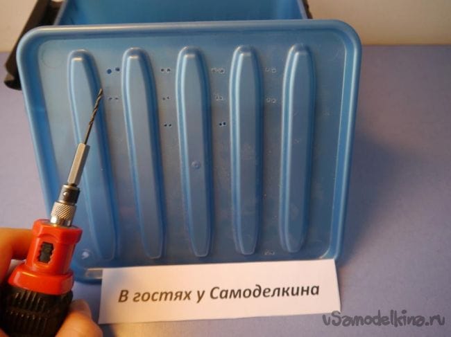 Затем на крышке проделаем 10 пар отверстий для светодиодов (расстояние возьмем по 5 мм между двумя отверстиями)