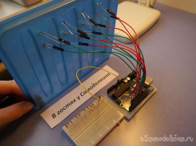 Шаг№4. Соединяем проводами (мама-папа) 10 выходов контроллера (со 2 по 11) с анодами светодиодов. Анод - это более длинная ножка. Если перепутаете полярность - гореть ничего не будет.