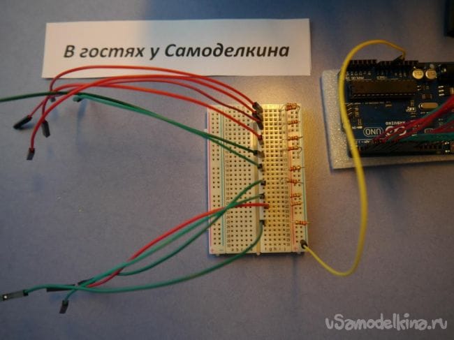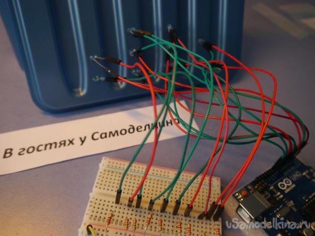 Шаг№5. На макетной плате напротив каждого резистора вставляем еще 10 проводков.