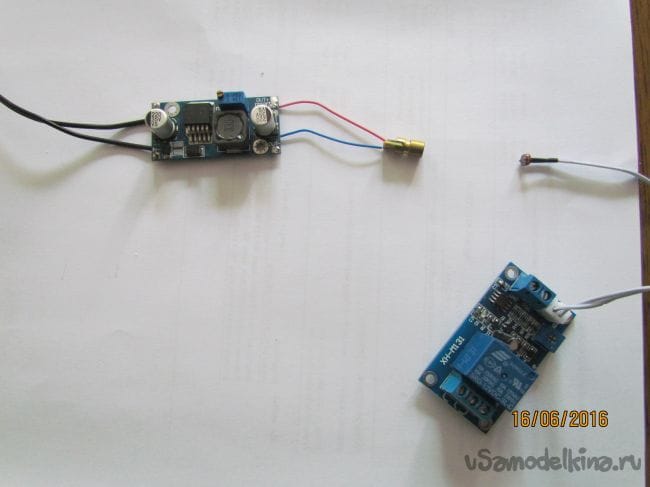 Когда лазер светит на светочувствительный элемент сенсора реле разомкнуто , как только луч прерывается срабатывает реле и включает охранную сирену. Чтобы реле сразу не выключалось после ухода грабителя. Необходимо установить реле задержки, которых в сети много.