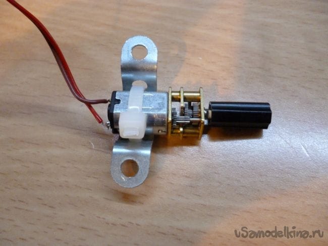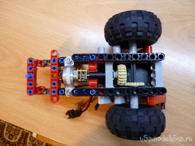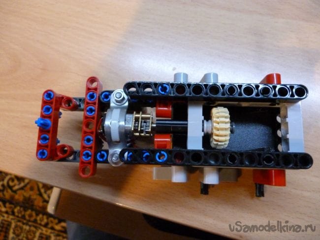 Возникает только проблема соединения мотор-редуктора с деталями конструктора. Я решил это следующим образом: надел на ось мотор-редуктора соединительную втулку и вставил обрезок спички для фиксации. Для крепления мотор-редуктора использовал металлическую пластику от железного конструктора и хомутик. Получилось следующее: