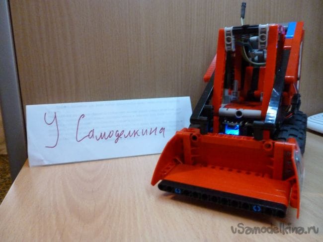 Подключаем IR приемник, моторы и диоды согласно схеме, ставим кабину сверху шасси, крепим ковш (ковш можно изготовить любой):