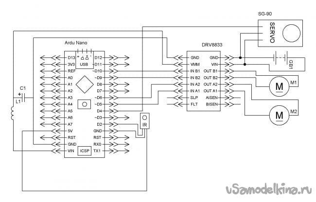 Устанавливаем Arduino Nano и DRV 8833 на свои места: