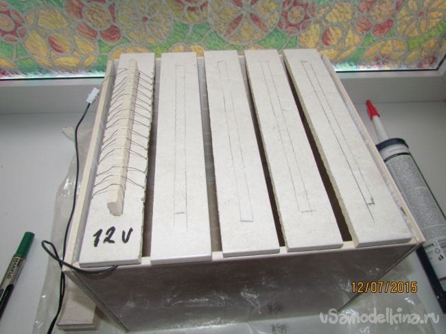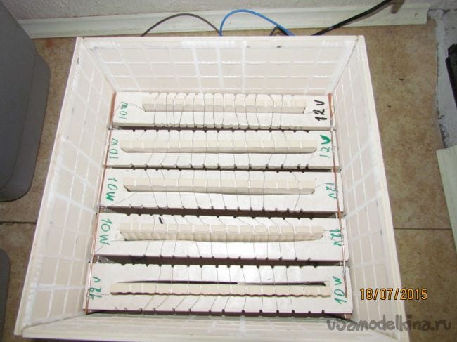 Из кусков плитки делаем крест с надпилами и на них наматываем провод . До этого я провод протестировал на блоке питания в моем случае нагрев до 60 градусов происходил на отрезке 1,1 м.
