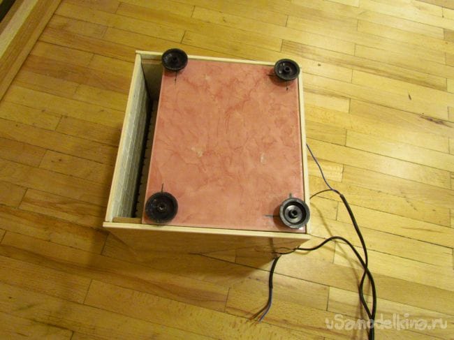 Снизу конструкции прикручиваем ножки и оставляем отверстие для циркуляции воздуха .