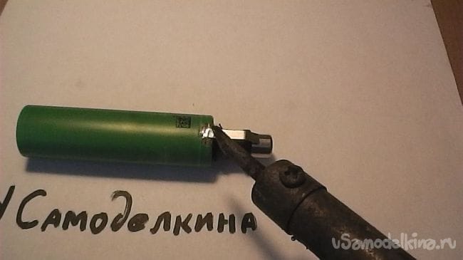Пружинящую латунную полоску припаиваем к корпусу аккумулятора. Так как он сделан из железа, то паять его надо с ортофосфорной кислотой. Затем полоску обрезаем и делаем изгиб с таким расчётом, чтобы при нажатии на неё она обеспечивала надёжный контакт с наружным стаканчиком вставленного атомайзера.