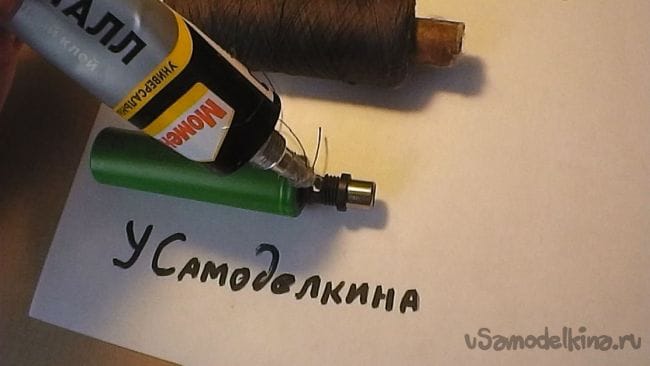 Фото 18 Так как плюсовой вывод разъёма не обладает высокой механической прочностью, то я делаю так. Обматываю уже припаянный вывод ХБ-шной ниткой довольно плотно, периодически смазывая участок клеем "Момент" до заполнения, пока намотка не сравняется по диаметру с резьбовой частью разъёма.