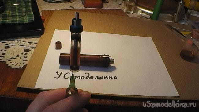 Фото 11 Вставляем собранный узел в корпус бывшего шприца. Для облегчения этого процесса лучше смазать окружности вкладышей жидкостью для заправки.