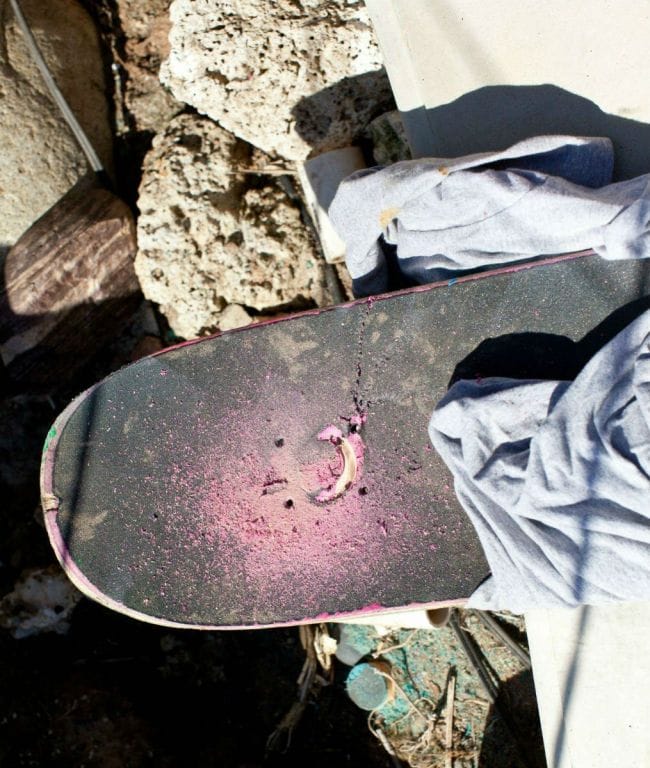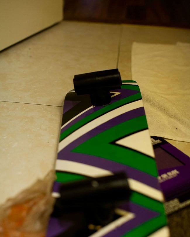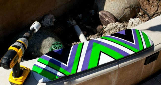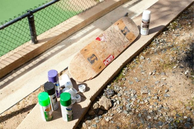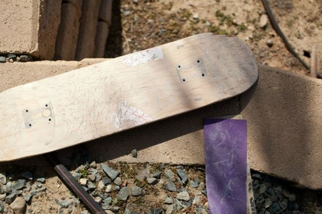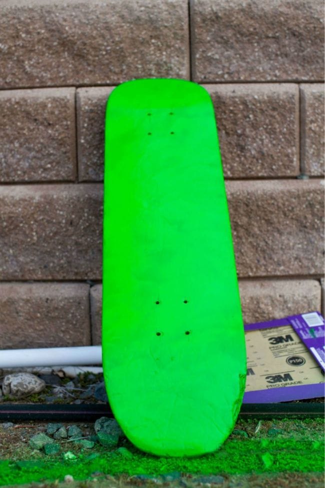 Начнем с того, что разберем доску, снимаем колеса и все крепления. Нам понадобится только доска, а так как доска старая и рисунок стерся, нужно стереть его окончательно, шлифуем поверхность наждачной бумагой.